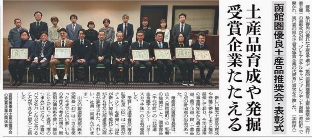 函館新聞2025年4月26日「第69回函館圏優良土産品推奨会表彰式」山大の「牡蠣の油漬」最高賞の市長賞受賞