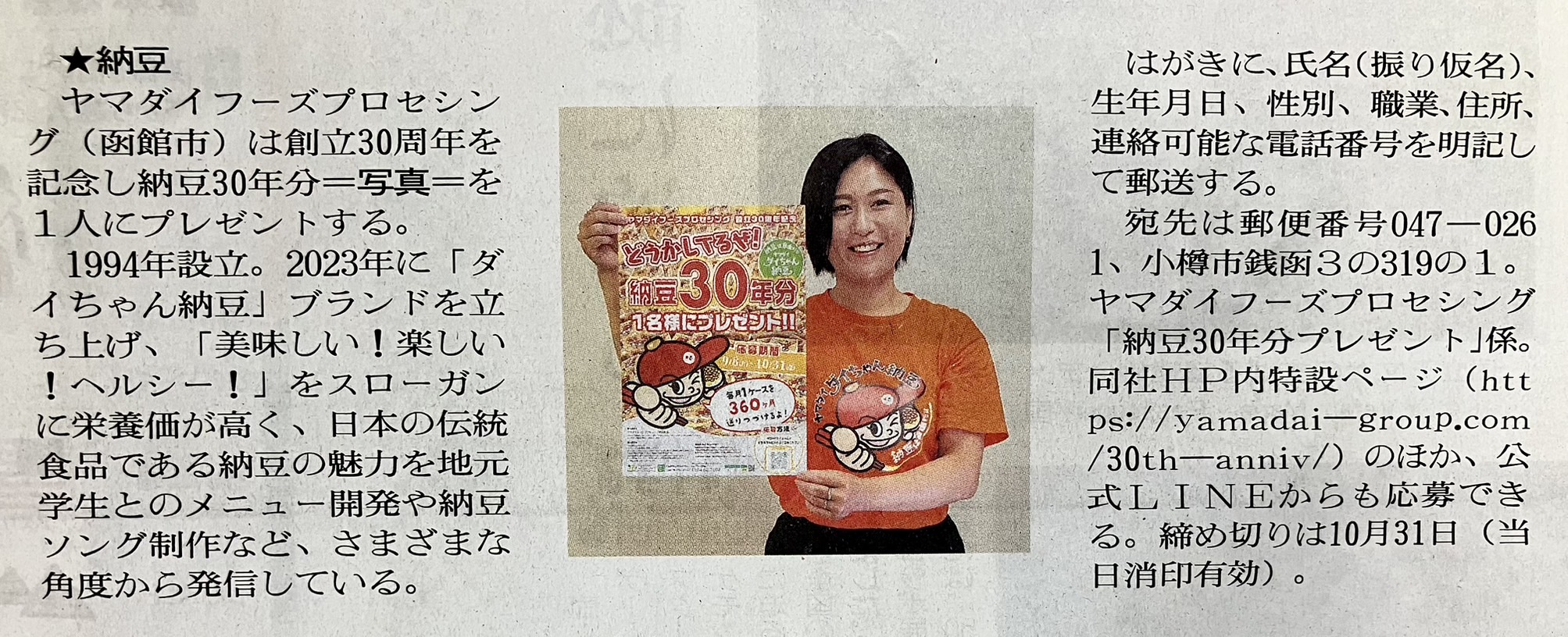 苫小牧民報2025年9月13日「納豆30年分を1人にプレゼント」